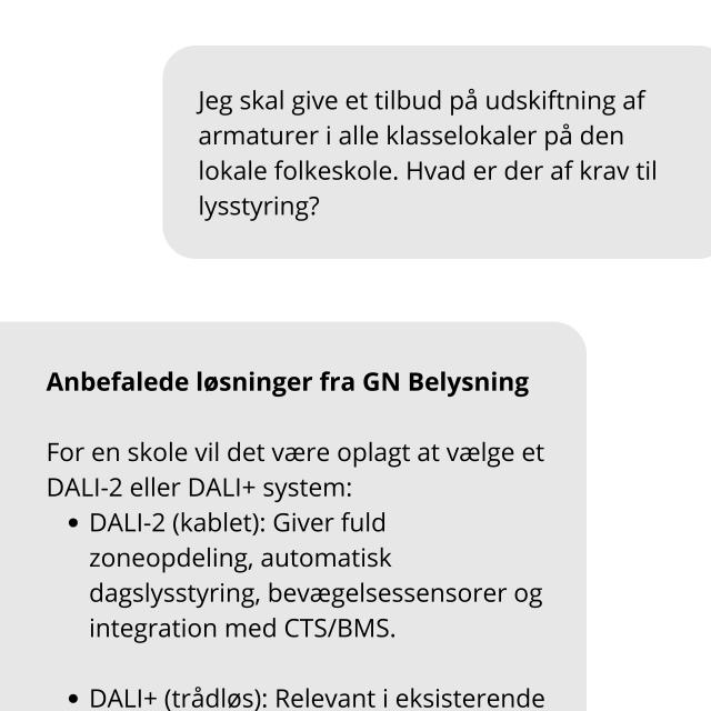 Med vores nye GPT får du hurtige svar på alt fra lysstyring og drivere til de nyeste BR18-regler. Den oversætter alt det tekniske til noget, der er nemt at forstå – så du sparer tid og slipper for at rode med det selv.