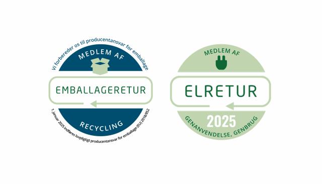 Derfor er vi medlem af Elretur, som hjælper os med at sikre korrekt bortskaffelse og genanvendelse af elektronik og batterier. Og med Emballageretur sørger vi for, at vores produkt- og transportemballage bliver håndteret efter EU’s krav.