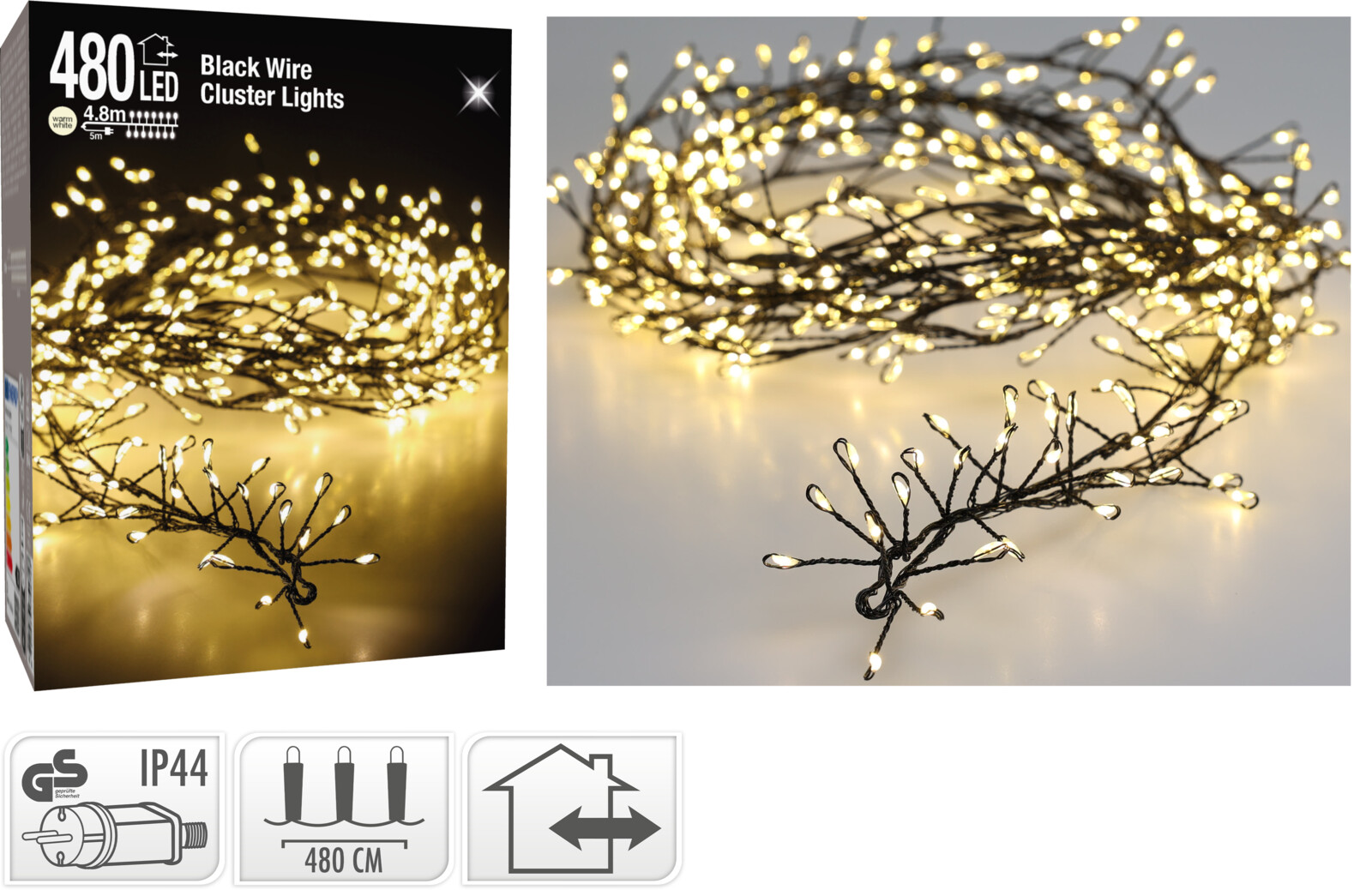 Clusterkæde lyskæde, LED blackwire med 480 varmhvide microled. Længde 4,8m. 5 m