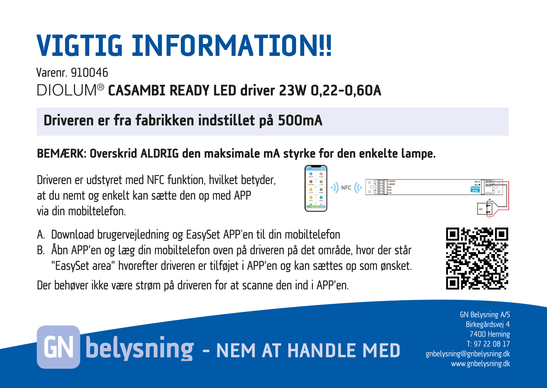 Outputstrøm og øvrige funktioner kan programmeres via NFC-interface
