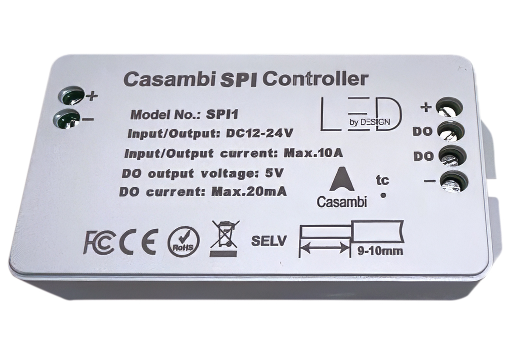 Casambi SPI controller er brugervenlig og nem at bruge. Den kan arbejde med SPI Pixel-kontrolprotokoller og understøtter de fleste af de almindelige IC'er, der bruges. Denne enhed kan styre op til 512 pixels (IC'er) RGB og RGBW.