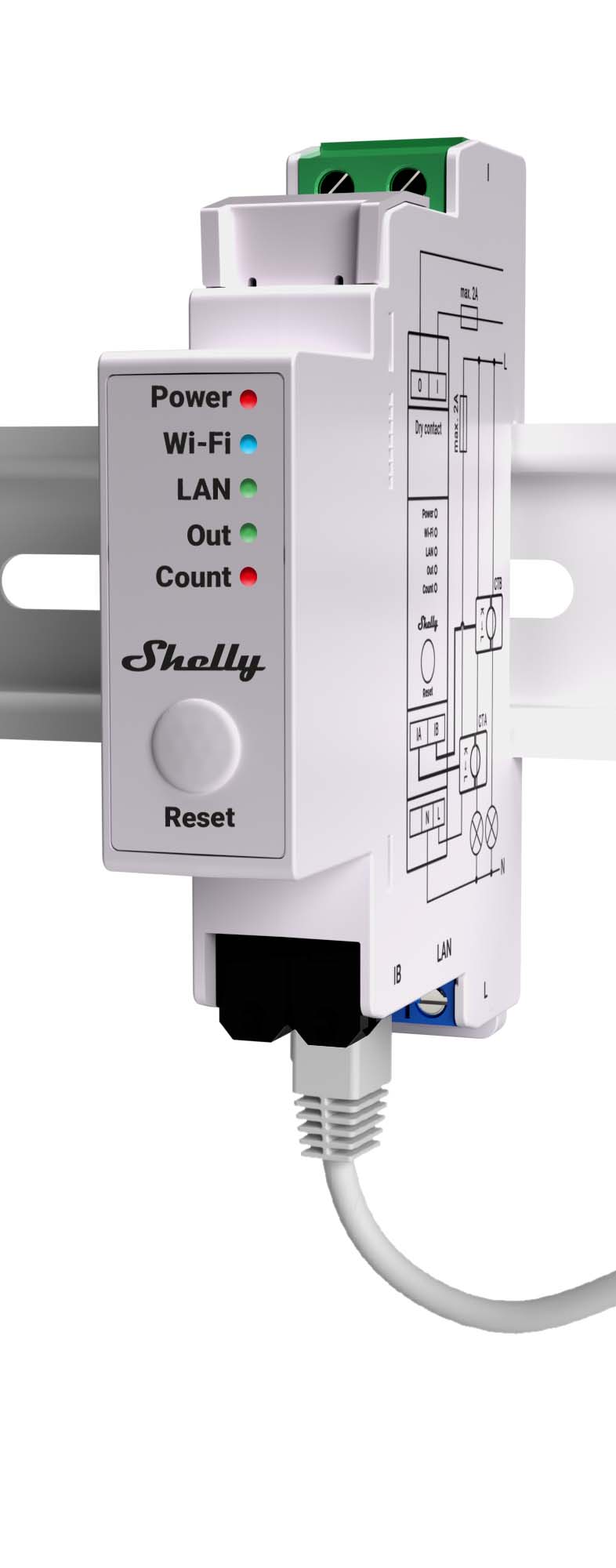 Shelly Pro EM-50 er en to-kanals enfaset energimåler, der bruger strømtransformere til at måle energi med en belastning på op til 50A og 99 % nøjagtighed.