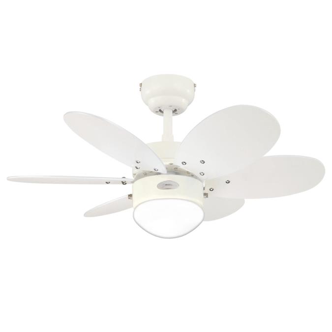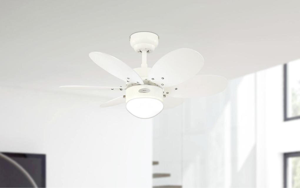 Flot loftventilator i hvid stål med vendbare vinger og indbygget lys